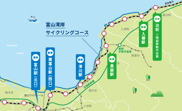 富山湾岸サイクリングコース ①入善駅―〈黒部駅〉―〈滑川駅〉―東富山駅(約46キロ) ②入善駅―ヒスイテラス(折返し)―東富山駅(約62キロ) ③黒部駅―海王丸パーク(約41キロ) モデルコースの詳細はこちら |
